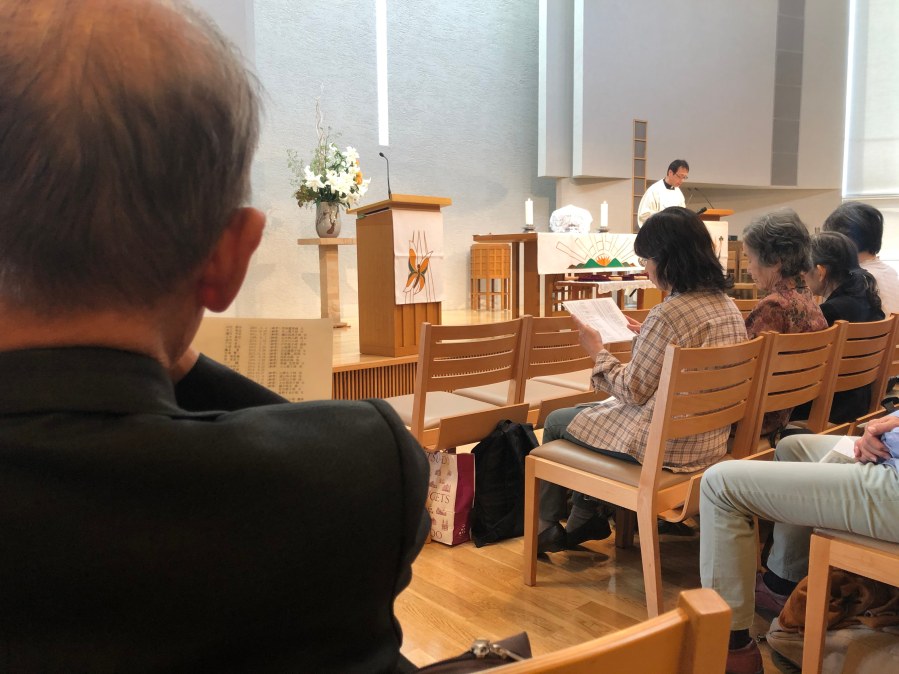 De i kirkas urnerom har hatt en kristen begravelse. Kirka var helt full av folk denne søndagen, det satt folk fra første til siste rad, og mange satt på galleriet. Den var rett og slett full av folk som til vanlig ikke går i kirka. Vi som går i kirka til vanlig ble bedt om å sette oss bakerst eller på galleriet. Dette blir for oss et vitne om at det er mange kristne i Japan som er alene om sin tro i familiene sine. Hvor tøft det må være!