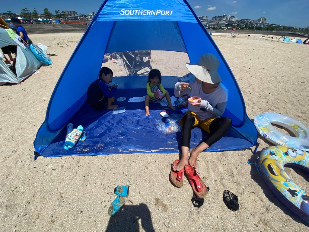 Kobe (eller riktigere sagt fylke Hyogo) har oppgitt mange nye regler for strendene i nærområdet. Dette er gjort for å begrense bruken av dem. Som sagt er det et folkerikt området vi bor i, og på sommeren er strendene angivelig vanligvis helt stappfulle av mennesker på land og i vannet. Vi synes det er lurt av Kobe å oppgi slike nye spesielle regler nå i disse tider. På den måten blir ikke strendene store samlingsplasser hvor koronaviruset får smitte fritt mellom mennesker fra hele byen og omheng. Eksempler på regler som nå gjelder ved strendene i nærområdet er for eksempel at det bare er barn som kan bade i vannet. Et annet eksempel er at det ikke er lov til å nyte alkohol på stranda i år, noe mange japanere angivelig gjør mye av vanligvis. Kobe har også beskrevet at de ønsker at det er barnefamilier som skal benytte seg av strendene. Og det ble godt synlig for oss at reglene virkelig gjør at det er romslig på stranda. Alle som er på stranda har med seg et lite telt. Dette teltet er helt nødvendig når man er på stranda i steikende sol når gradestokken viser 37 varmegrader i skyggen.