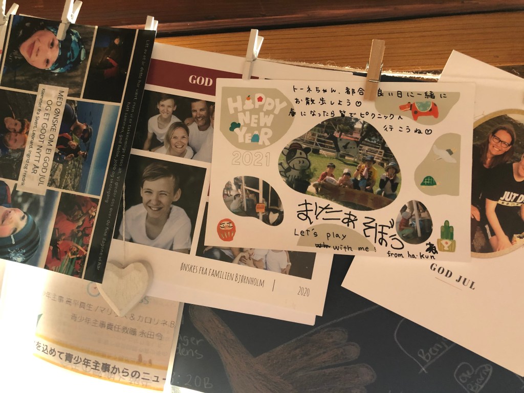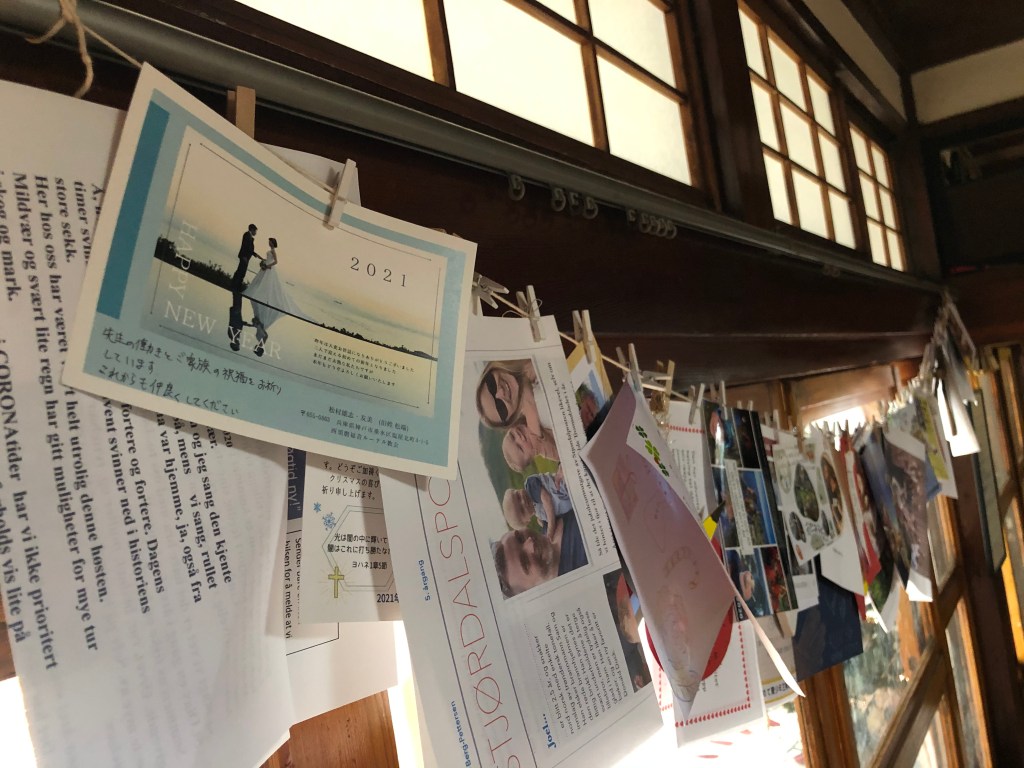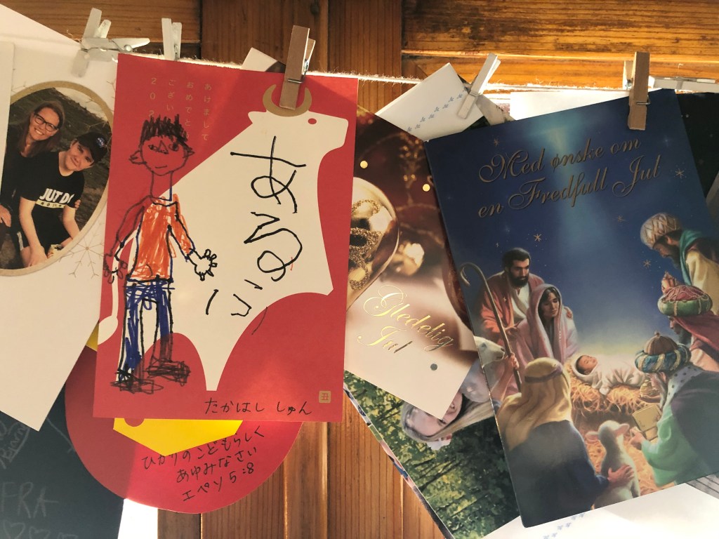 Ikke lang tid etterpå fikk vi flotte japanske nyttårskort i retur fra disse gode naboene våres. Snoren med alle de norske julekortene har aldri vært finere enn i år når vi også har flere japanske nyttårskort på den!