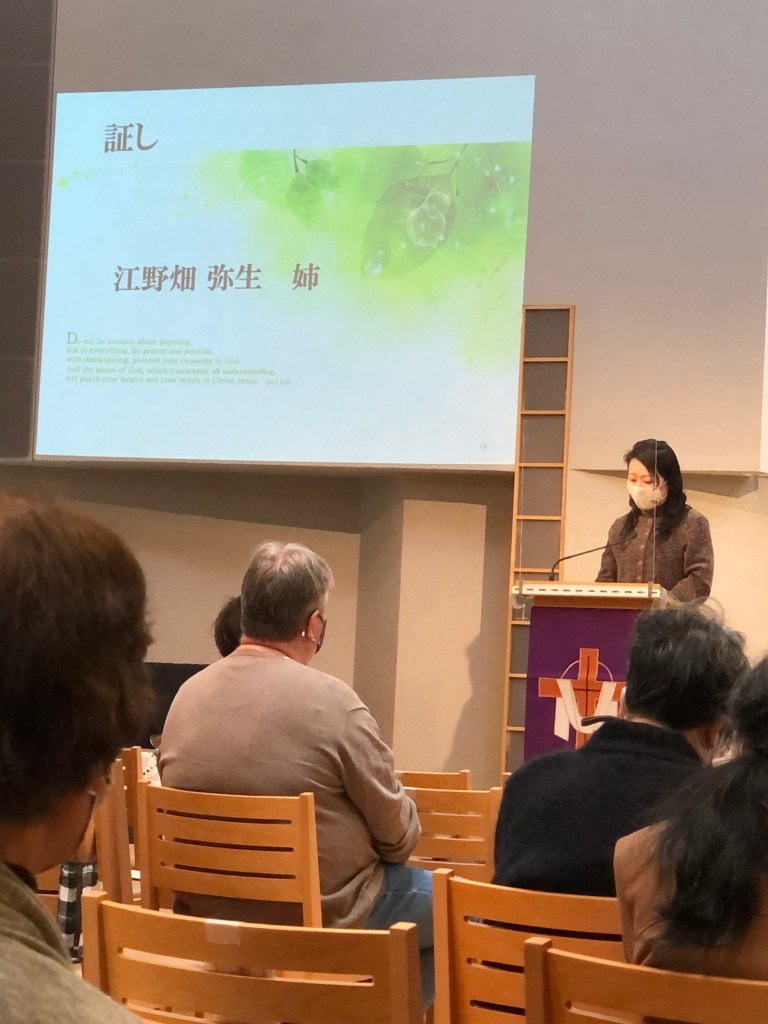 På gudstjenesten fikk vi høre vitnesbyrd fra to damer. De fortalte om hvordan de hadde begynt å tro på Jesus. Hun ene er elev på bibelskolen i år, mens den andre damen hadde flyttet tilbake til Japan nå etter å ha bodd flere år i Amerika. Bibelskoleeleven hadde gått på en av de mange store katolske High Schoolene som finnes her i byen. Der hadde hun for første gang sett og lest i en Bibel. Mye av forkynnelsen på den katolske skolen hadde vært vanskelig å forstå for henne, men ved tilfeldigheter hadde hun etter High School kommet innom Aotani kirke. I Aotani kirke hadde hun lettere forstått forkynnelsen, og hun hadde virkelig blitt interessert i Jesus – og tilslutt kunne hun ikke annet enn å begynne å tro på Jesus. Den andre damen fortalte hvordan hun i kontakt med kristne mennesker hadde blitt nysgjerrig på Jesus mens hun bodde i utlandet. Og hun hadde der i et annet land valgt Jesus som Herre i sitt liv. Det er mange japanere som bærer frem et vitnesbyrd om å ha blitt nysgjerrige på og tilslutt valgt å tro på Jesus mens de har bodd i utlandet. Hvorfor mange japanere begynner å tro på Jesus mens de er i utlandet, kan man på mange måter finne flere ulike forklaringer på. For oss er ikke årsaken til dette fenomenet viktig. Det er virkelig flott å få høre andre menneskers vei til tro på Jesus. Hver historie er unik selv om de også kan inneholde flere fellestrekk. Vi takker Gud for disse to flotte damene, og for deres flotte vitnesbyrd.