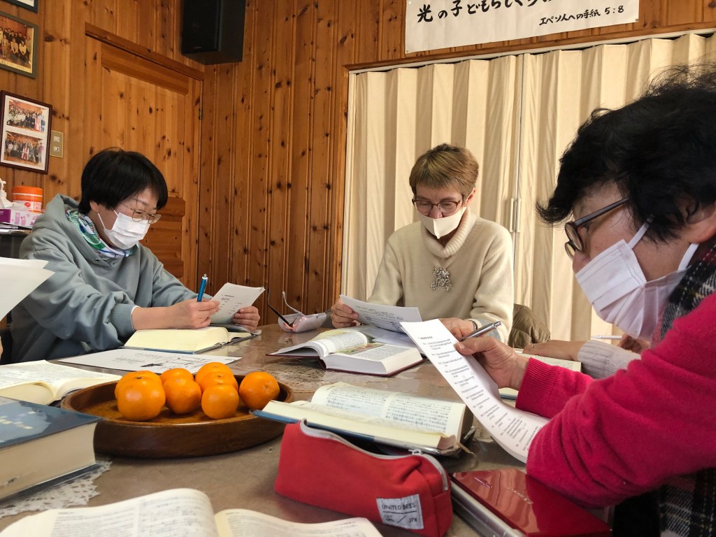 Onsdag 3.mars deltok vi på vår finske kollega Lea Lukka sin Bibel Class som hun jevnlig har i Seishin kirke. Her kommer flere kvinner til kirka for å studere bibelen på engelsk. En fin klubb du kan delta på når du kanskje synes det er litt voldsomt å bare studere Bibelen, men samtidig så er du litt interessert i Bibelen – så hvorfor ikke gjøre det i kombinasjon av å lære engelsk. Det var flott å delta på en klubb hvor engelske verbbøyninger ble gjennomført kombinert med spørsmålet om Jesus virkelig ble forlatt av Gud da han hang på korset. Det blir et naturlig rom for både læring og undring med en slik klubb, det blir en gøy klubb.