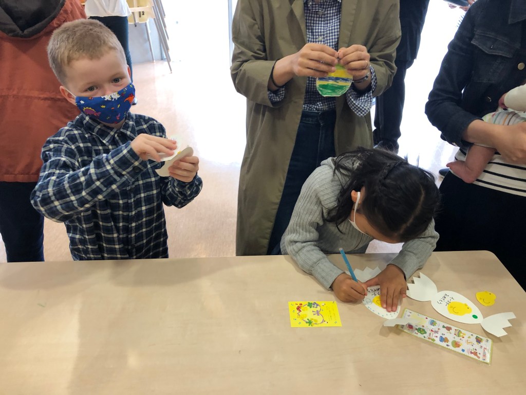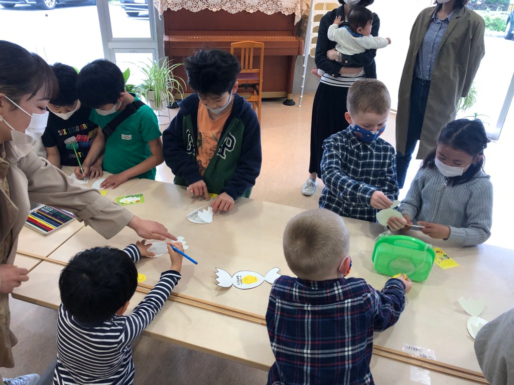 I år sammenfalt nemlig påska med den japanske vårferien som markerer skolens nye kalenderår – og med meldte regnbyger hele dagen, var det mange barn som hadde anledning til å komme til kirka. Ryktet hadde også spredt seg om at det skulle være ekstra gøye aktiviteter etter søndagsskolen denne søndagen.