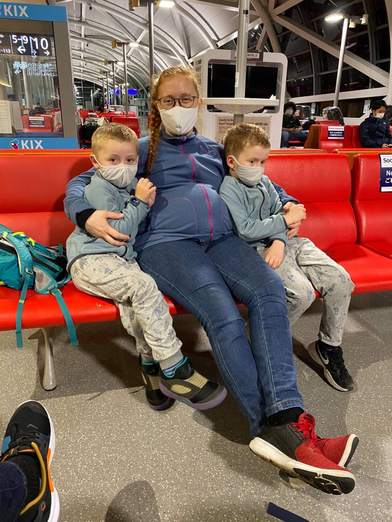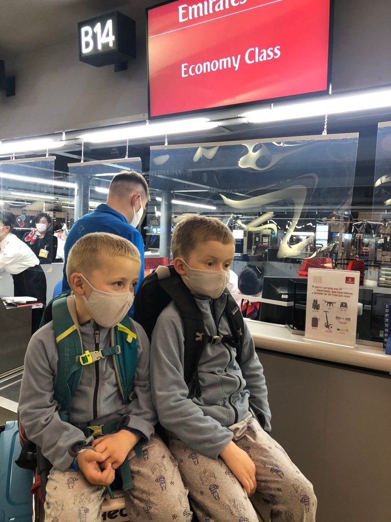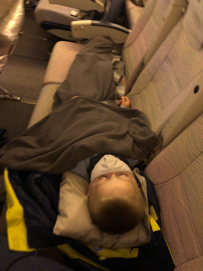 Vi startet å fly fra Japan til Dubai ved midnatstid japansk tid. Noen trøtte gutter ventet så fint mens vi sjekker inn i Japan, og med lite folk på dette flyet ble det fint for dem begge å sove i vannrett stilling over tre stoler hver ved siden av en av oss voksne. Det ble et godt utgangspunkt for den videre lange reisa.
