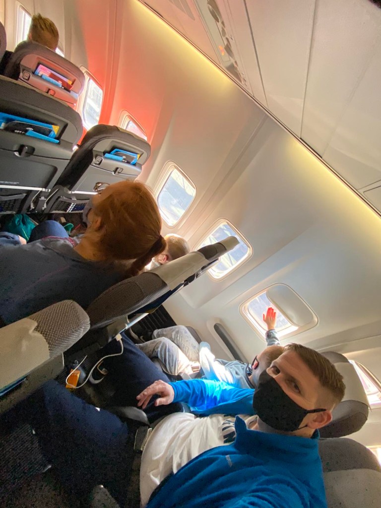 Etter negativt resultat på koronavirustest tatt på Gardermoen, og etter at bagasjen ble hentet og levert videre på neste fly, måtte vi ta en jubel-selfie. På det siste flyet nordover hadde vi vindusplasser. Det var flott å se ned på Norge mens vi fløy.