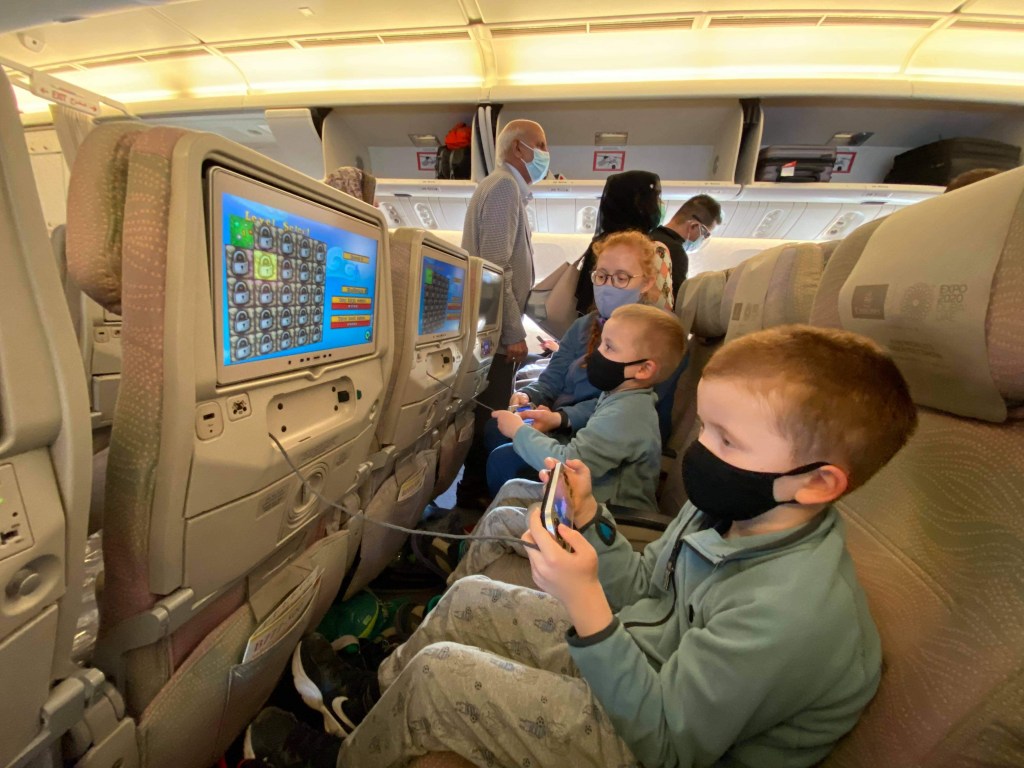 Da vi var våkne på flyturen fra Dubai til Oslo, satt vi oss sammen på en rad. Dette flyet var også litt fullere, men ikke fullere enn at vi som en familie på 4 mennesker hadde 2×4 seter i flyet til disposisjon.