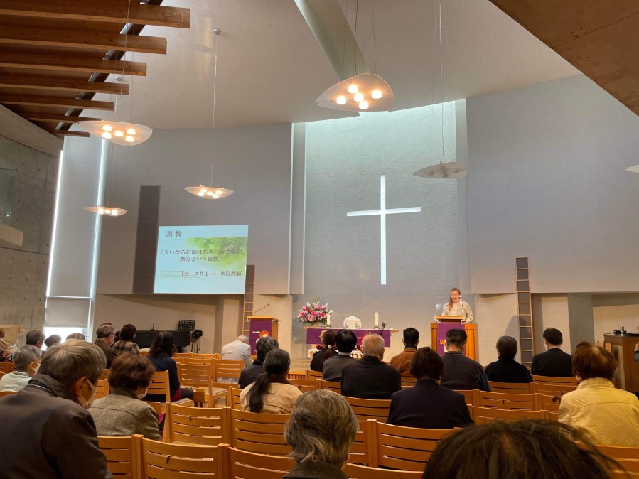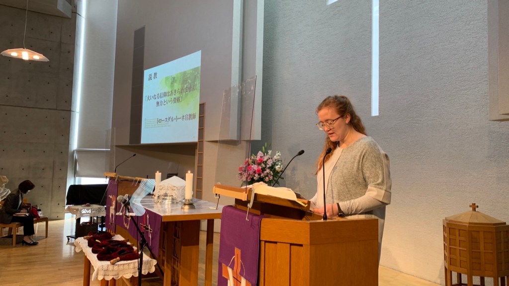 Tone talte over teksten som står i Mateusevangeliet kapittel 15 vers 21 til 28, og det er på mange måter en litt rar tekst om ei dame som på mange måter maser på Jesus for å få hjelp fra han. At Jesus ikke gir henne hjelp med en gang, er underlig ved første øyekast – men hennes pågangsmot og tro på at Jesus virkelig kan hjelpe henne er så fint. Japansk er et vanskelig språk, og nå etter nærmere 4 år i landet er det fremdeles masse vi enda ikke kan av grammatikk og ord. Dette gjør at både Tone og Ole Bjarne ender opp med et enkelt språk når vi preker, enklere språk enn det japanerne selv vil bruke når de taler. Tone opplevde etter å ha preka i kirka at en 85 år eldre dame kom bort til henne og sa: Endelig forstod jeg hva denne bibelteksten forteller oss, det har plaget meg helt siden tenårene at jeg ikke har forstått denne bibelteksten.