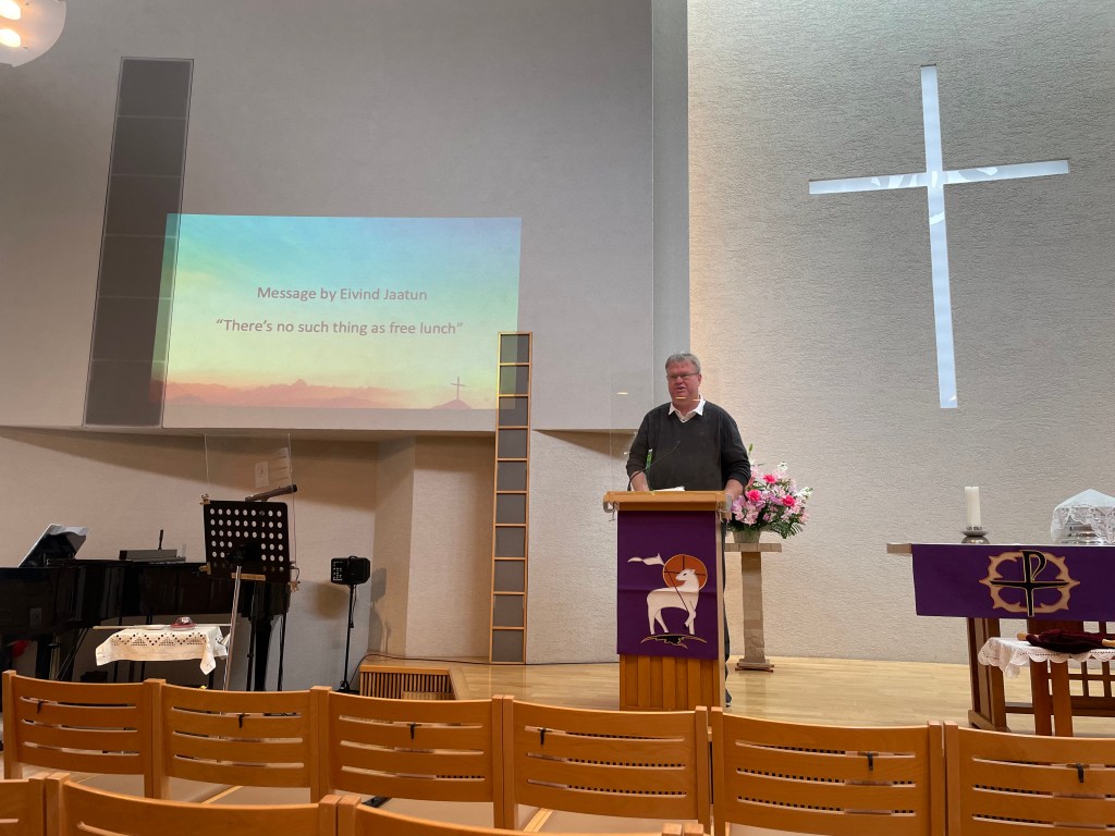 Utpå ettermiddagen hold vi engelsk gudstjeneste også. Dette er noe som vi har tatt initiativ til å starte som en forlenget arm til de engelske kafeene vi også driver på med i kirka og i vårt eget hjem. Vi synes menneskene i kirka har vært så tøffe til å stille opp og snakke engelsk, og med det har den engelske gudstjenesten blitt et fint samarbeid. Vi opplever stadig at mennesker fra nabolaget eller bekjente kommer innom gudstjenesten for å sjekke ut hva den er og for å lytte til engelsk tale. Det krever mye menneskelige ressurser å gjøre en engelsk gudstjeneste, så på sikt får vi se om det er verdt å holde den i gang eller om den bare skulle være for en stund. Denne søndagen var det tale av Eivind Jåtun på engelsk.