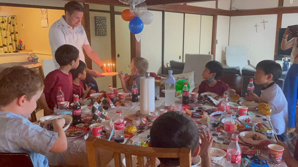 Det er ikke vanlig å ha slike barnebursdager med venner i Japan. Når barn har bursdag, samles familien også feires det. Derfor har vi ikke hatt barnebursdager for guttene våres før de har gått i 1.klasse. Vi inviterte alle guttene i klassen, og det var så kjekt å møte og bli kjent med alle dem som kunne komme. Benjamin var storfornøyd med barnebursdagen sin, og glad over å kunne vise hjemmet sitt og lekene sine til kompisene på skolen. Og for de fleste oppmøtte var det første gang de hadde vært i en slik barnebursdag, så også de hadde det veldig gøy sammen med oss. For en velsignelse og fylle huset sitt opp med glade barn. Vi velger å takke Jesus for det.