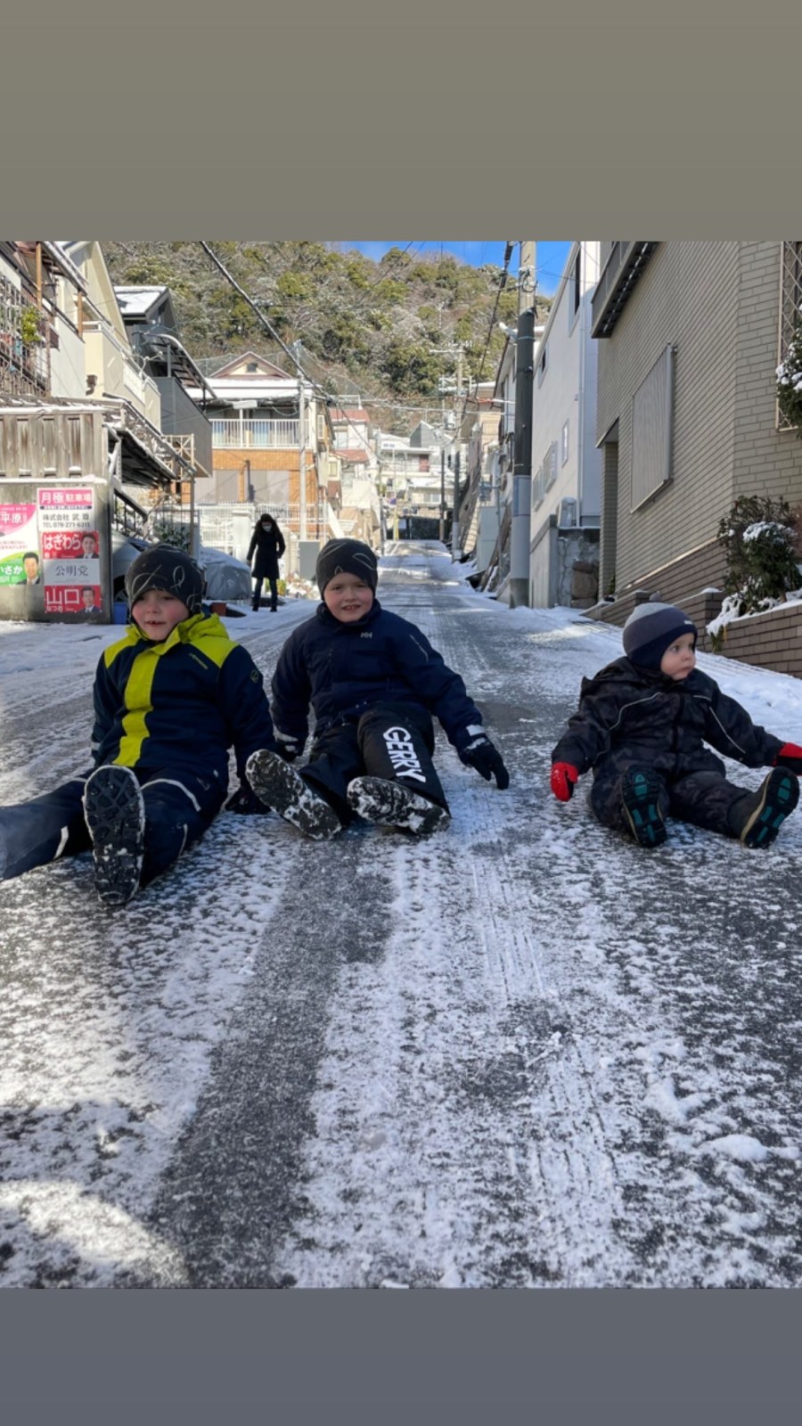 Klimaet er slik i Kobe at ingen av oss har vinterdekk, selv ikke byens busser har vinterdekk. Så når det kommer den ene dagen med veier dekket av is og snø, stopper bare alt helt opp. Fordelen med at alt stopper opp er jo at man får tid til å leke i snøen med naboene våres mens den fortsatt er der denne ene dagen.