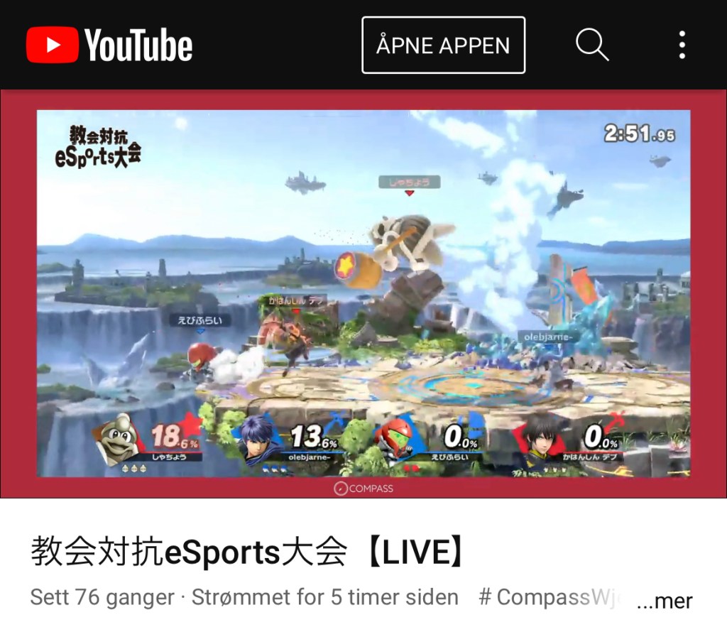 Vi fant oss en TV og fikk samlet oss rundt et bord i kirka, alle hadde spillkonsollene klare – snart skulle eSport eventen begynne. Alle lag skulle kjempe mot hverandre i spillet Super Smash Bros. Aotani kirke hadde meldt seg på med to lag og en solospiller. Og plutselig er det hele i gang med LiveYouTube-sending og alt.
